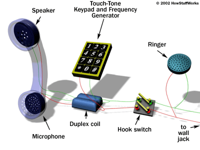 The problem with the phone shown above is that when you talk, you will also hear your own voice through the speaker. Many people find that annoying, so today's phones contain a device called a duplex coil or something used to block the sound of your own voice from reaching your ear. A modern telephone also has a bell so it can ring as well as a touch-tone keypad and frequency generator for dialing digits. Today's phone looks like this: